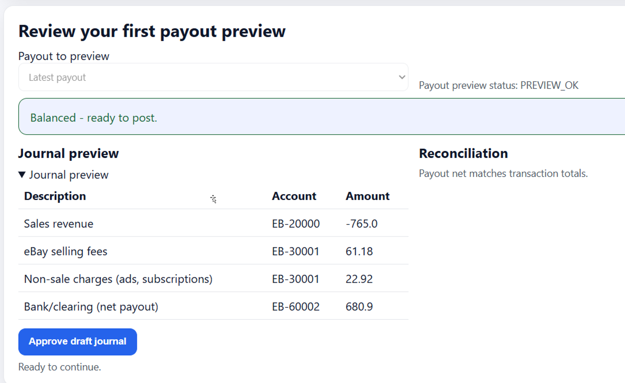 SalesToAccounts is a narrow bookkeeping sync for UK eBay sole traders using eBay Managed Payments and Xero. It turns each payout into one Xero entry for that payout so sales, fees, refunds, and adjustments are easier to review and reconcile.
