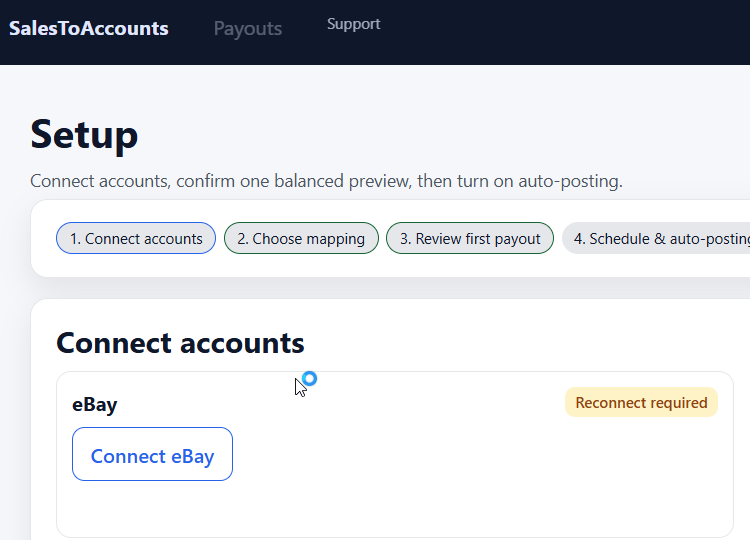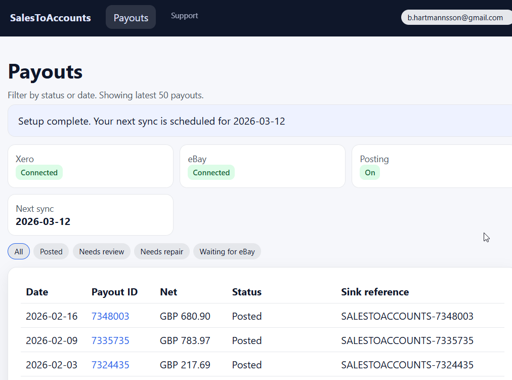 SalesToAccounts is built for UK eBay sole traders using eBay Managed Payments and Xero on a non-VAT, cash-basis, single-entity, GBP-only setup